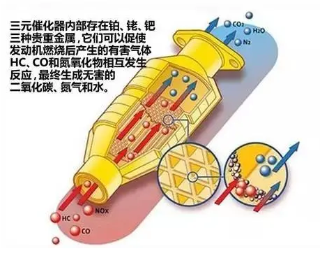 大部分汽車中都有一個(gè)配件——三元催化器,它能減少諸如一氧化碳、碳?xì)浠衔锖偷趸衔锏扔泻怏w的排放,是汽車中一個(gè)比較重要的組成部分。轉(zhuǎn)換器中的某些化學(xué)反應(yīng)會(huì)將有害物質(zhì)轉(zhuǎn)換為二氧化碳、水和氮。