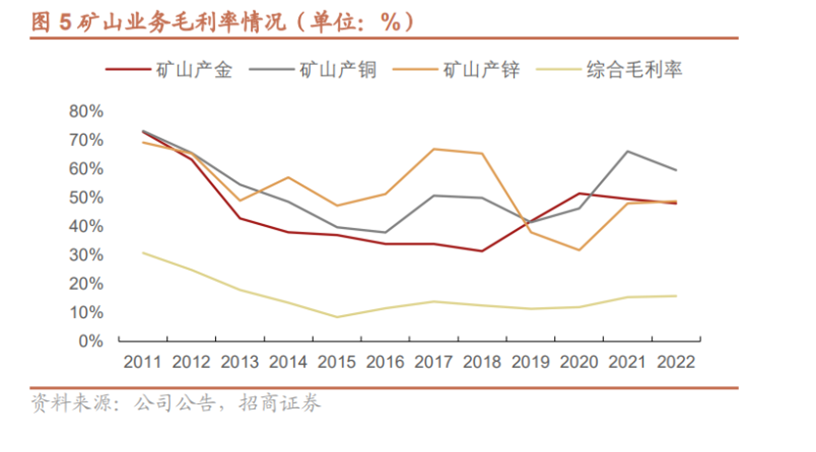 2022年,紫金礦業(yè)全年實現營業(yè)收入達2703億元,凈利潤達200.42億元,其中礦山產金毛利率47.97%,礦山產銅毛利率59.53%,礦山產鋅毛利率48.69%。