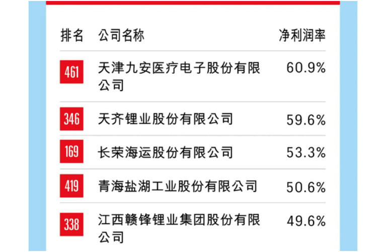 值得注意的是,在凈利潤率方面,排位最高的五家公司中,有三家是鋰電池相關行業,其中天齊鋰業的凈利潤率高達59%,位列利潤率榜第二位,青海鹽湖和贛鋒鋰業分別以50.6%和49.6%的凈利潤率位列全部榜單的第四和第五位。
