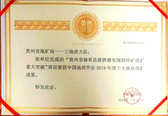 豬拱塘鉛鋅礦是地質(zhì)找礦新機(jī)制“商業(yè)跟進(jìn)”的又一成功范例,其重大找礦成果被業(yè)界高度認(rèn)可,先后榮獲中國地質(zhì)學(xué)會(huì)頒發(fā)“2018年度十大地質(zhì)找礦成果獎(jiǎng)”、第七屆“中國有色金屬地質(zhì)找礦成果獎(jiǎng)”一等獎(jiǎng)。