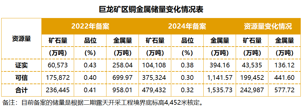 公司充分運用“礦石流五環歸一”礦業工程管理模式對巨龍銅礦資源情況進行重新評價。2022年備案時,估算巨龍銅礦銅邊際品位為0.3%,而此次備案估算邊際品位為0.17%。