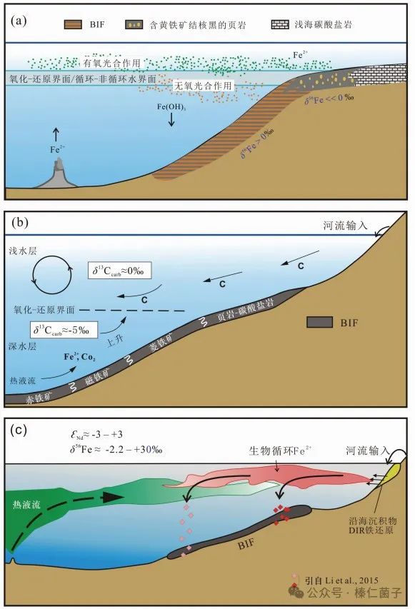 在早期地球,大氣主要成分是二氧化碳,缺少氧氣。地表風(fēng)化作用中,鐵主要呈二價(jià)鐵溶解在水中,隨河流被被帶入大海,在海水呈溶解于水的二價(jià)鐵化合物富集。因?yàn)橹参锏墓夂献饔茫髿狻⒑Q笾卸趸疾粩鄿p少,氧氣增加。在植物生長(zhǎng)比較旺盛的淺海地區(qū),海水中的氧氣含量高,二價(jià)鐵被氧化成不溶于水的三價(jià)鐵氧化物,沉淀成為條帶狀鐵礦。