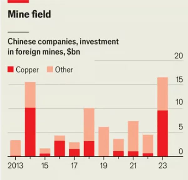 在具體礦產(chǎn)投資上,中國(guó)公司也非常具有戰(zhàn)略性。《經(jīng)濟(jì)學(xué)人》稱,隨著中國(guó)在電池、電動(dòng)汽車和太陽(yáng)能電池板等產(chǎn)品上越來越具有競(jìng)爭(zhēng)力,中國(guó)對(duì)海外礦業(yè)的投資也越來越多。銅礦是電氣化的重要材料,去年中國(guó)企業(yè)對(duì)這種這礦產(chǎn)的投資約占其海外礦產(chǎn)投資的3/5。
