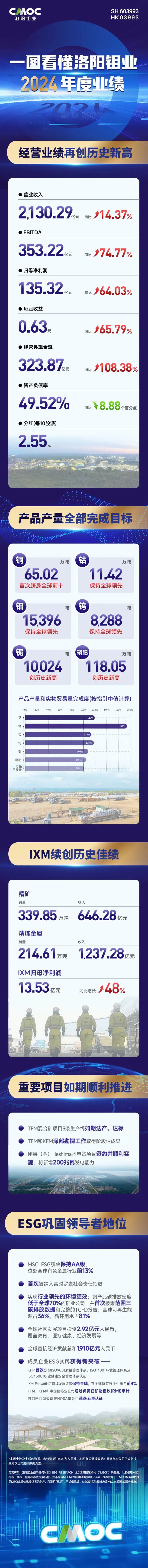 3月21日,洛陽鉬業發布的業績報告顯示,公司2024年營業收入首次邁入兩千億元門檻,為2130.29億元,同比增長14.37%;歸母凈利潤首破百億元,為135.32億元,同比增長64.03%;扣非后歸母凈利潤131.19億元,同比增長110.48%;每股收益0.63元,同比增長65.79%。