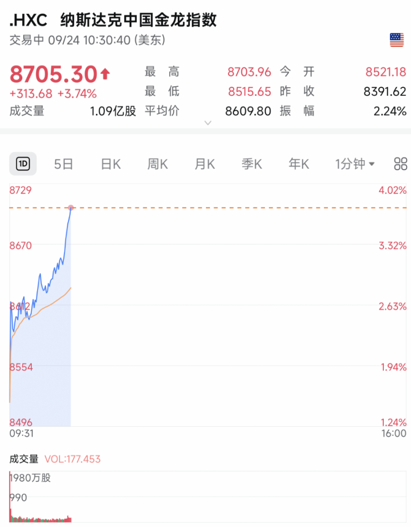 截至收盤,納斯達(dá)克中國(guó)金龍指數(shù)收漲2.83%,熱門中概股普漲。