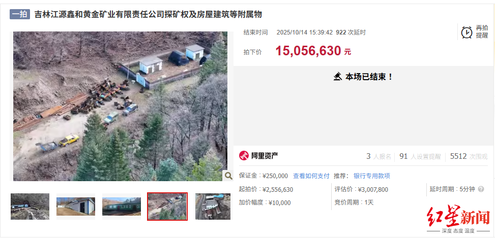 紅星資本局近日消息,吉林江源鑫和黃金礦業(yè)有限責任公司探礦權及房屋建筑等附屬物在阿里資產(chǎn)拍賣平臺被拍賣,本次拍賣經(jīng)過931輪出價(包括922次延時出價),最終以1505.663萬元的價格成交,對比起拍價255.663萬元,溢價1250萬元,溢價率達489%。
