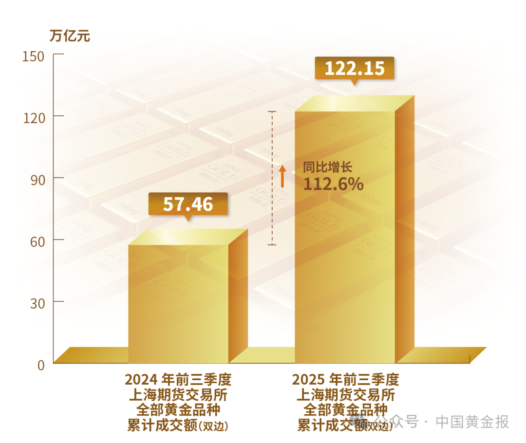 不同品類黃金產(chǎn)品的表現(xiàn)差異明顯。輕克重、附加值高的首飾產(chǎn)品仍保持較強(qiáng)市場(chǎng)吸引力,銷(xiāo)售情況較好。金條需求仍然旺盛,地緣沖突加劇與經(jīng)濟(jì)不確定性使得黃金避險(xiǎn)保值的功能進(jìn)一步凸顯。電子、新能源等產(chǎn)業(yè)的快速發(fā)展使得工業(yè)用金需求穩(wěn)步回升。 黃金市場(chǎng) 2025年前三季度,上海黃金交易所全部黃金品種累計(jì)成交量單邊2.38萬(wàn)噸(雙邊4.76萬(wàn)噸),同比上升2.45%;累計(jì)成交額單邊17.68萬(wàn)億元(雙邊35.35萬(wàn)億元),同比上升41.55%。上海期貨交易所全部黃金期貨期權(quán)累計(jì)成交量單邊10.36萬(wàn)噸(雙邊20.72萬(wàn)噸),同比上升59.98%;累計(jì)成交額單邊61.08萬(wàn)億元(雙邊122.15萬(wàn)億元),同比上升112.6%。